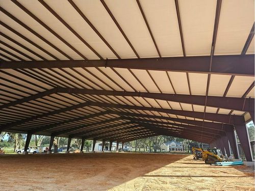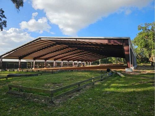 This impressive 150' x 300' riding arena offers a massive 45,000 square feet of covered space, providing ample room for multiple riders to train comfortably out of the intense Florida sun. Constructed with durable red iron components, this structure is built to last. The arena is outfitted with premium vinyl-backed roof insulation to help maintain a cooler interior temperature, along with a full gutter and downspout system to efficiently manage rainwater runoff.